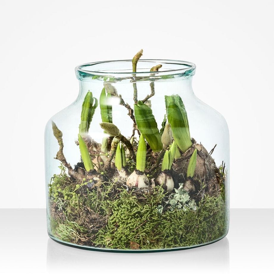 Onze bloembollen in vaas zijn een echte blikvanger. De bloembollen met voorjaarsbloemen worden geplaatst in een onze stevige, handgemaakte en mondgeblazen vaas. De bloembollen worden omhuld met mooie groenmaterialen. De bollen worden voornamelijk in de knop geleverd en zullen geleidelijk tot bloei komen. De bloemkleuren en soorten kunnen variëren, omdat we elke week een unieke selectie van bijzondere bollen hebben.
